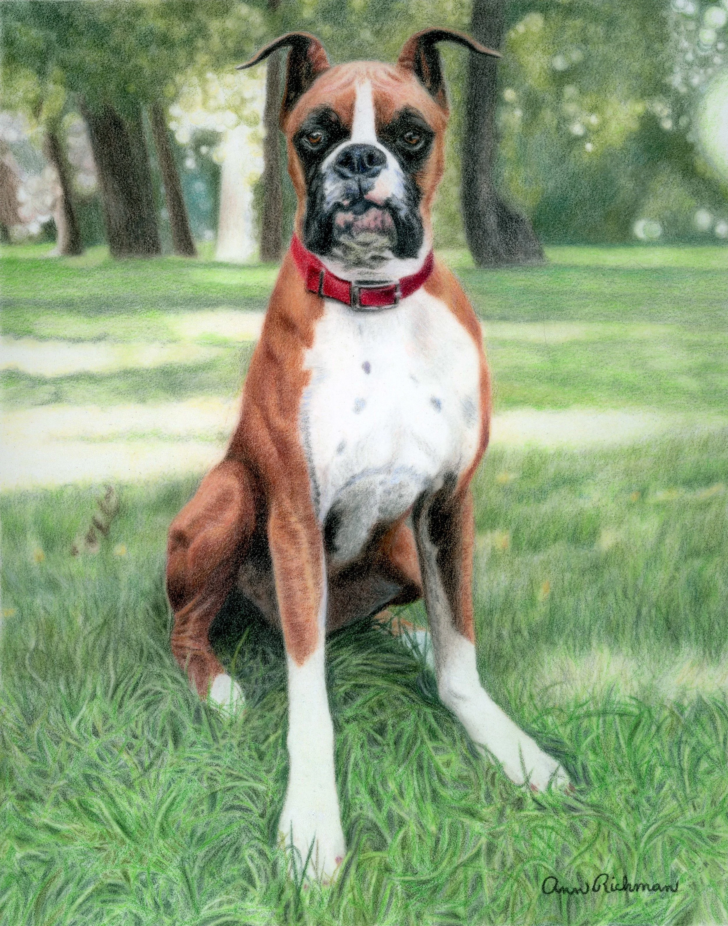 I rendered the grass in the above piece (“Phoebe”) by adding at least 6 to 7 layers and then burnishing with a white or light green pencil. I repeated this process until I was satisfied with the results. As you can see, the end drawing is saturated with color and not grainy.