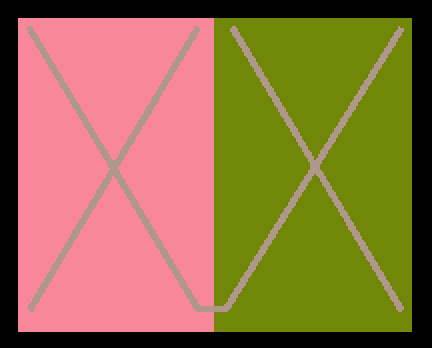 The hue used in creating the X shapes is exactly the same. However, due to simultaneous contrast, it looks different in the context of the pink rectangle versus the green rectangle.