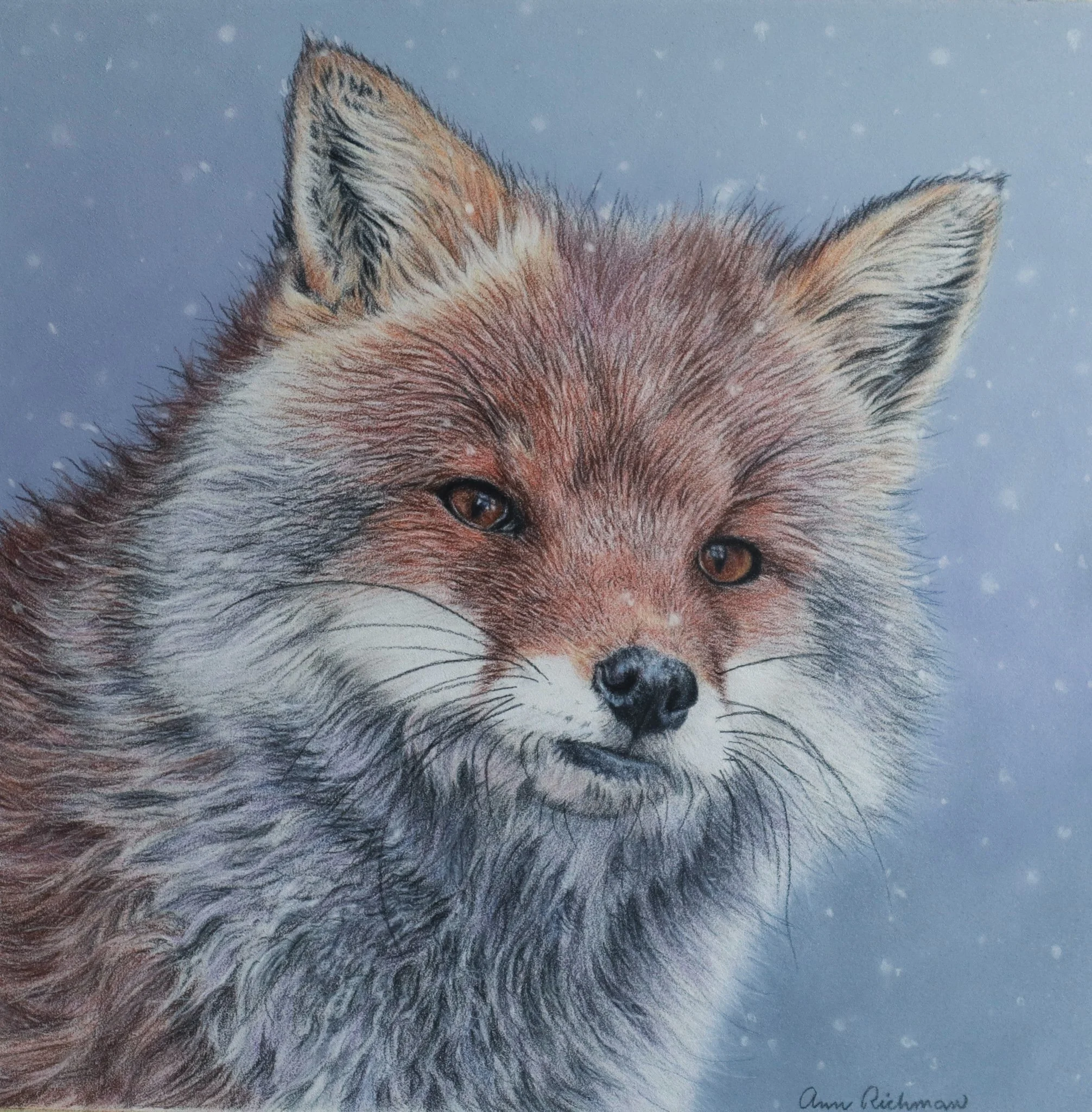 “Snow Fox”, by Ann Richman. This fox was drawn with Polychromos and the background was rendered with pastels pencils.