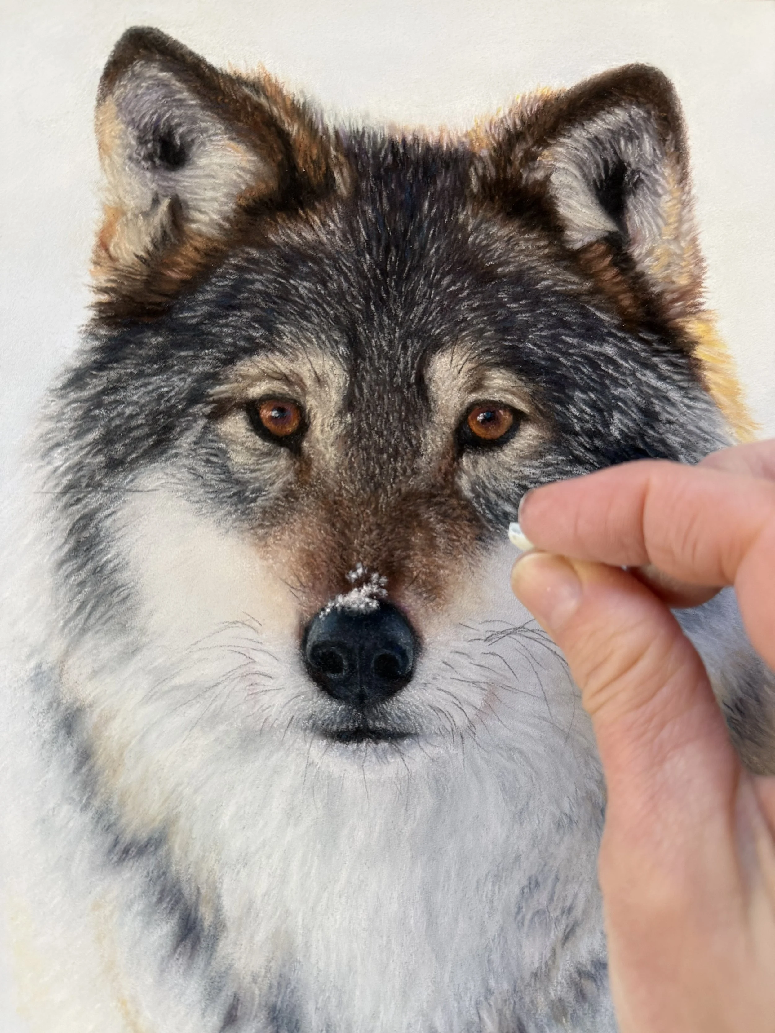 On the wolf’s head, for example, I initially tried pastel pencils to create the lighter fur on his forehead, but the marks were not saturated enough to show through. After experimenting, I discovered that small shards of Unison Blue Violet 9 worked beautifully. That same hue appears in the snowy background, so using it in the fur helped unify the piece. It also made sense visually, since the cool light from the snow (and sky) would naturally reflect into the wolf’s coat.