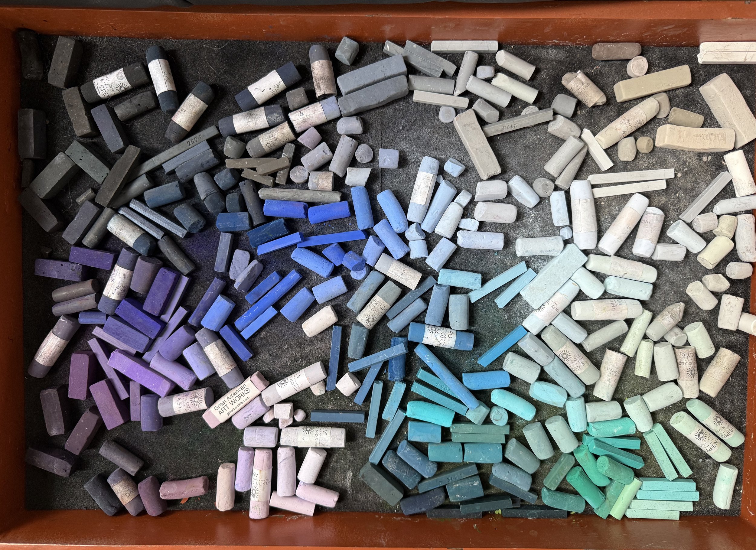 One of the trays holding part of my soft pastel collection. There are a few medium and slightly harder sticks mixed in, but the majority are Unison, with a sprinkling of Terry Ludwig, Great American, and Sennelier, all of which are beautifully soft.