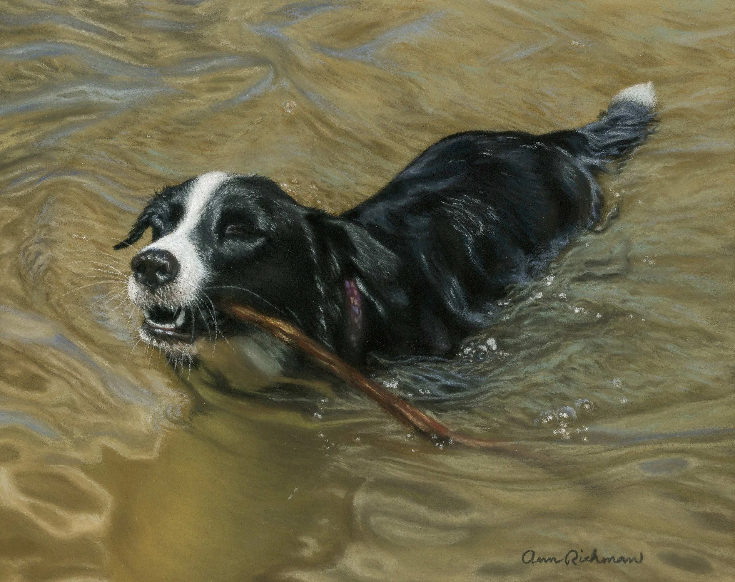 Biggie Goes For A Swim. Her name is Addie, but we affectionately call her Big or Biggie. Her brother is smaller, so we call them “Big” and “Little” and one thousand other nicknames. This piece is small- 8”x 10”- and so I used many fragments of soft pastel to complete it.